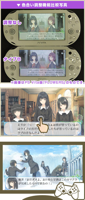 PS Vita用ソフト「FLOWERS冬篇」の原作はPC用ソフトのため、グラフィックは一般的なPC用液晶モニターにあわせて彩色されています。
